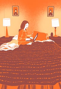 Behind the Birds of Paradise and bougainvillea a writer sits in bed... writing.