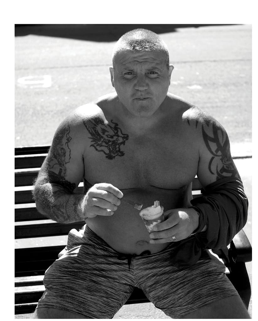 Although it’s been more than four decades since he shot his earliest photos in Weymouth, it’s not what has changed but what has stayed the same that resonates in the new work, an air of disheveled provincialism captured in portraits of a (paddling) pool party, a tattooed bruiser eating ice cream, and a group of bored youths waiting for their future to begin. McKell can empathize. He was one of them once. “Most of us left Weymouth in our twenties, and headed to London,” he says. “I’d never have come back if it wasn’t for the circumstances, but it turned out to be the right place to be at the right time.”
