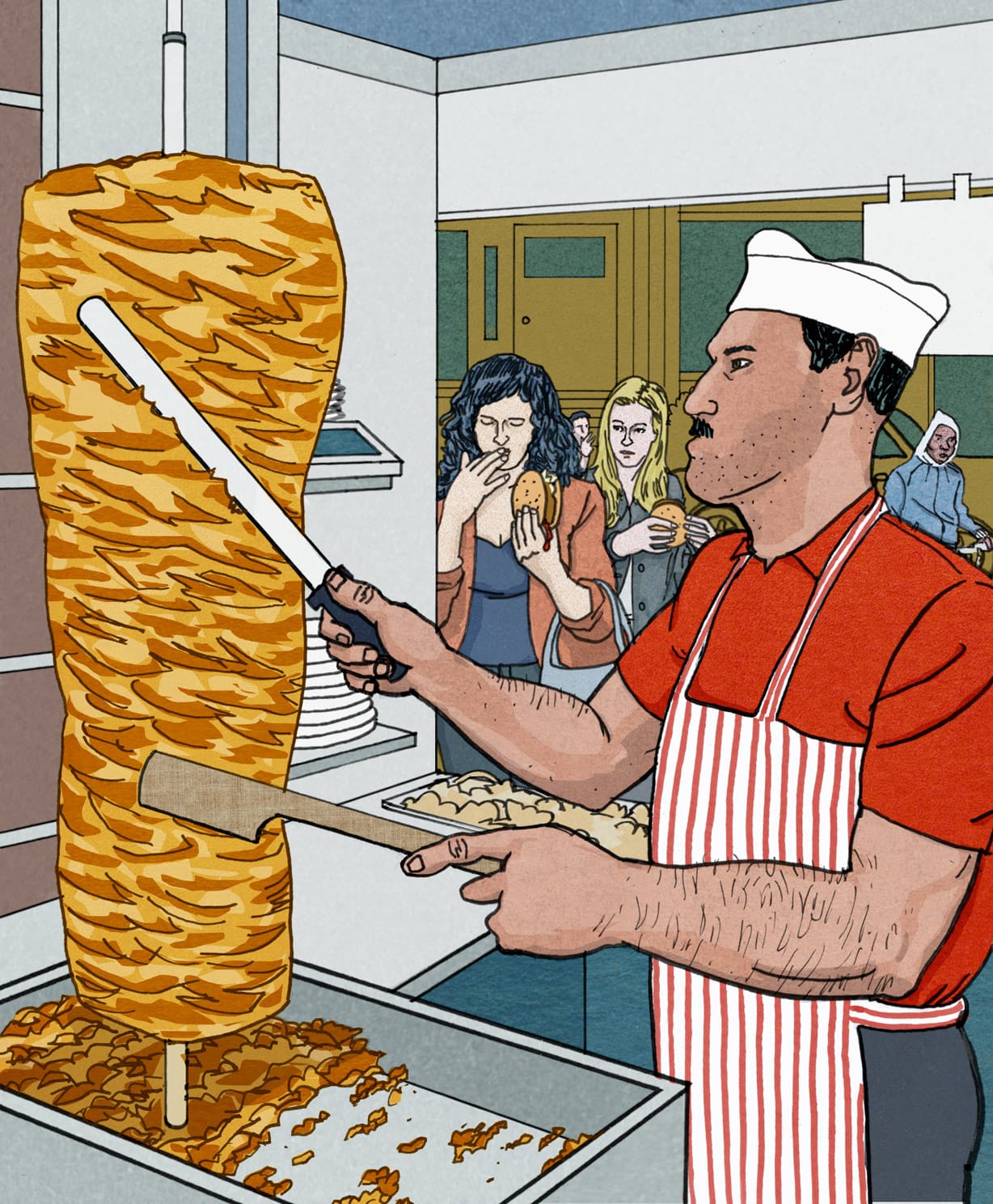 Later will be more difficult. The nightclub around the corner closes soon, which means drunks. They will barge into the shop and shout orders over each other, pointing fingers at the menu overhead or at the trays behind the glass. Shishandchipsmate. Fuckingshishandchips. Farid will struggle to understand and he will make mistakes but tonight Hassan will not be there to help him. Hassan’s wife is having a baby. Right now she is pushing and he is in the hospital waiting room waiting for the child to slither out. Farid thinks about Hassan’s pretty wife on the bed with her legs open, covered in blood. He slices through a bag of frozen limbs with his switchblade.