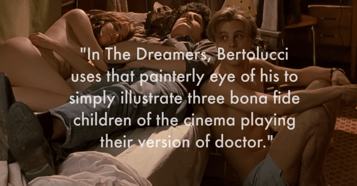 And yet, the hypocrisy of their escapades is that the rebellion and the revolution are in fact happening outside their steamed-up windows—in the wide world that exists beyond the movie screens and celluloid dreams that have them drunk on fantasy. They are their very own Band of Outsiders, and in one of the most memorable scenes of The Dreamers, Bertolucci has them recreate the race through the Louvre made memorable in Jean-Luc Godard’s Bande à Part. But as the escapist allure of their indoor revolution is shattered (quite literally when a protester’s stone is hurled through an apartment window), Bertolucci’s final stroke is releasing Matthew, Isabelle, and Theo back into the wild, leaving the audience to wonder how much more innocence they have left to lose.