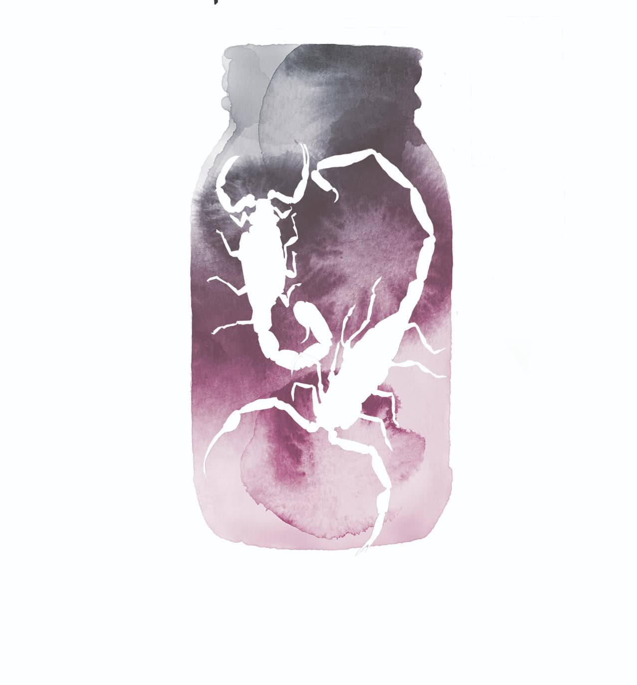 Another way we count the time is by the filling of the jam jar. On a stone bench outside of our respective bedrooms, Delphine keeps a jam jar full of alcohol and a pair of silver toast tongs. When we find a scorpion, we are meant to place it into this jar because Delphine has a friend here who bakes them into resin trivets. Ultimately, this friend would prefer that we deposited the scorpions live into the jam jar, but this is tricky with the bread tongs and it is more dangerous, so usually the scorpions arrive a little squashed, post shoe. One day, while we are video-calling with French friends confined across from a nursing home where the hearses come and go, we find a horrendous hard-shelled millipede flapping by our feet; it fights like an eel when my husband tongs it, its mouth utterly furious. I write the trivet man a message about this latest find and he says we’ve made his week. “Keep it up!” he writes me in an email.