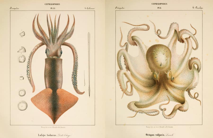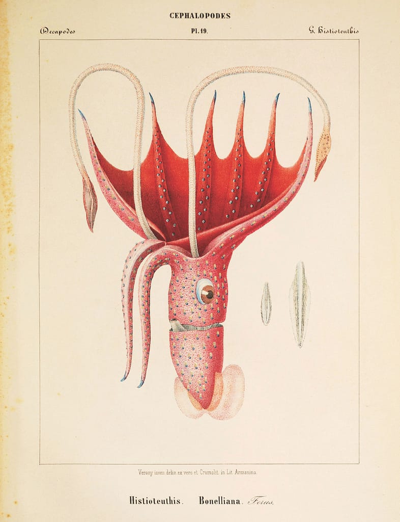 In 1851, Jean Baptiste Vérany made a promise remarkable for his time—to show sea creatures vividly alive, supple and shifting, rendered in dazzling chromolithographs. Inspired by a red umbrella squid he found washed onto the pebble beach in his hometown of Nice, he began paying fishermen who could bring him other specimens. In total he created 41 color plates, including one that would become famous as an illustration in Victor Hugo’s Les Travailleurs de la mer (Toilers of the Sea). Alas, Vérany was never credited as the illustrator, and would drift into obscurity shortly after his death.