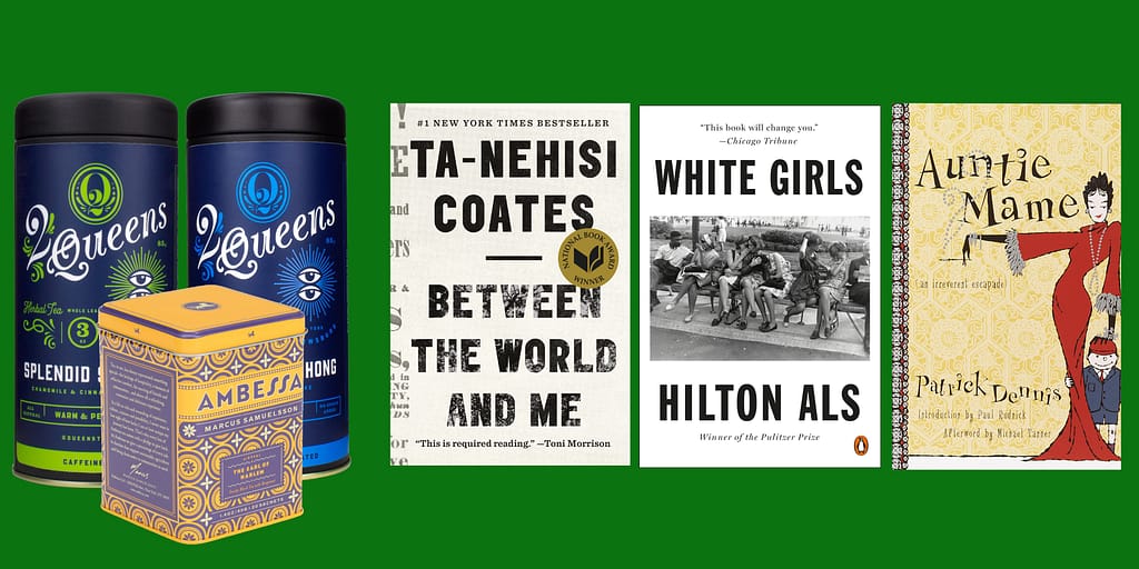 Includes a copy of Between the World and Me wrapped in our signature paper, four ounces of loose leaf Splendid Serenity, blended by 2 Queens, a custom bookmark and tag, and a tote bag., a custom bookmark and tag, and a tote bag.