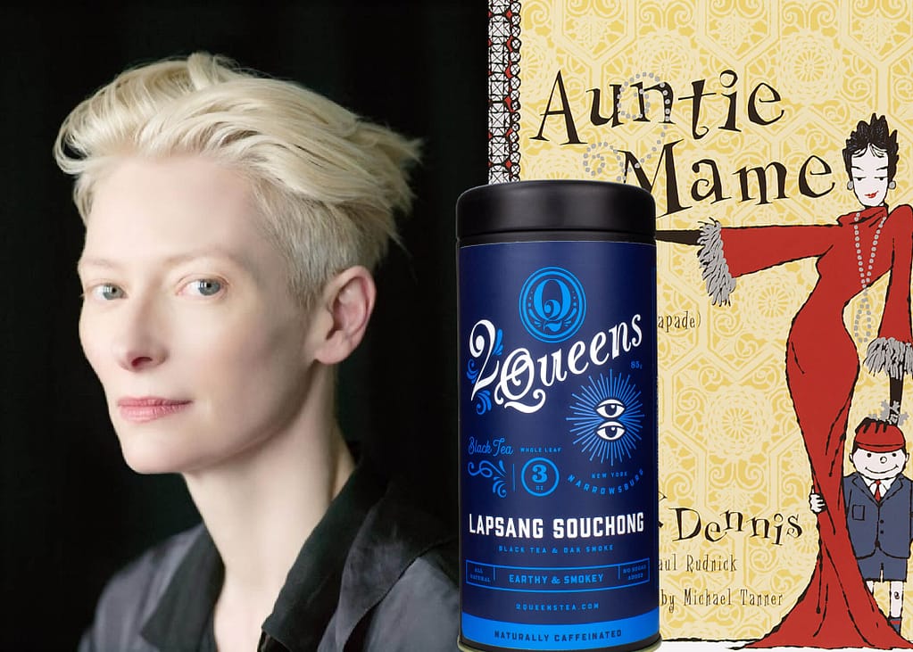 Includes a copy of Auntie Mame wrapped in our signature paper, four ounces of loose leaf Lapsang Souchong, blended by 2 Queens, a custom bookmark and tag, and a tote bag.