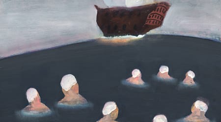 Add an impish sense of humor – inherited, he says from his grandmother – and you get pieces like “Distraction,” in which a square-jawed 1950s archetype of masculinity checks out a shirtless guy behind him. It’s an alternate version of postwar America in which Rock Hudson didn’t have to live in the closet.