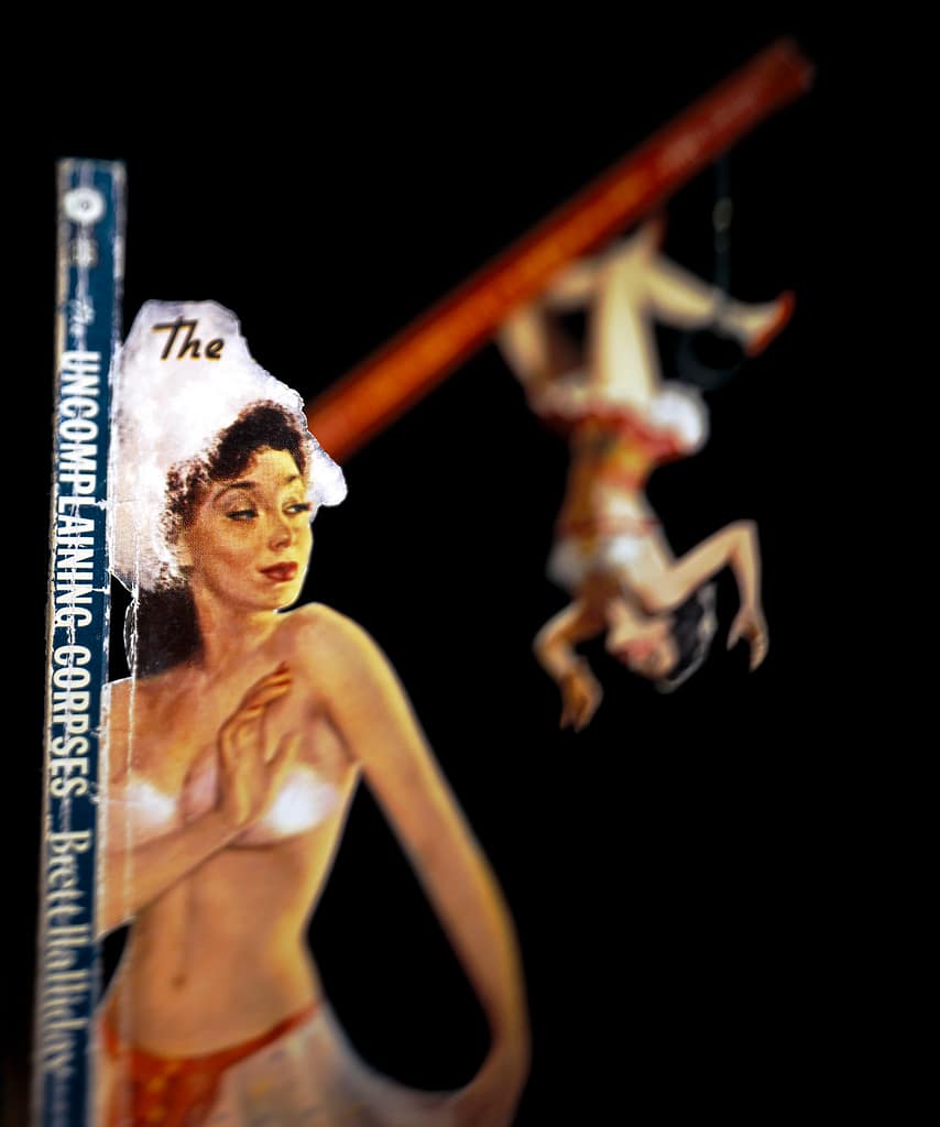 For each of his photos, Allen creates something akin to a pop-up, using an X-Acto knife to liberate figures from their original two-dimensional background. In an era of AI-generated images and photoshop the sense of texture and depth and human intervention feel quietly subversive. And because it is figurative and graphic, and often very funny, Allen’s work is a natural fit for art directors at magazines and publishing houses. After seeing his work at an art fair in New York, the legendary book designer Chip Kidd invited Allen to create covers for reissues of classic crime novels by James Ellroy. Commissions came thick and fast for Harper’s Magazine, The New Yorker, New York magazine, Vanity Fair, The Virginia Quarterly Review, and Out, where I first encountered his work during my time there as editor. I was smitten. Allen’s work takes the familiar and twists it into something fresh. It also serves as an encomium to the skilled artists who created the original covers, widely dismissed in their time. “They’re so realistic and sometimes the expressions are so exaggerated that the storytelling in the faces alone was what really drew me,” says Allen.