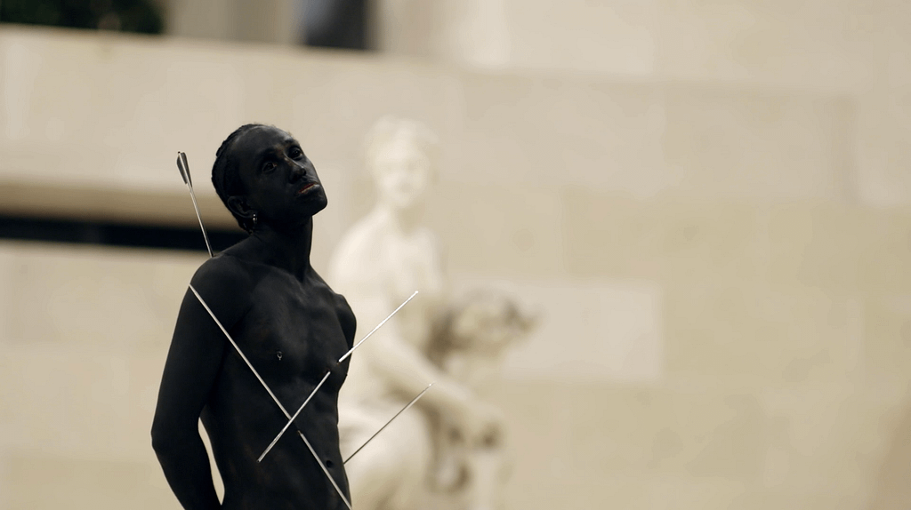 MG: Totally. I can relate it to the sensation of hyper-awareness of one’s body that comes with being Black. That’s very much at the center of my physical experience as a Black person—being repeatedly thrust into my body at random moments. Speaking of the endocrine system, I recently had a very intense encounter with adrenaline. I did this performance at the Louvre. It’s a piece based on St. Sebastian. These classical, iconic museums are filled with the great masters regurgitating the same stories, the same characters, the Virgin Mary, the saints, all of Greco-Roman mythology and deities over and over and over again. Botticelli and Bernini and Caravaggio and Delacroix, they all have their Mary’s, their Venuses, their Echos and Narcissuses. I wanted to put my work in that tradition, so I’m interpreting Saint Sebastian. I performed for five hours as him in the Cours Marly with these large silver arrows pierced through my actual skin. I don’t know if you’ve ever been stabbed before, and I don’t recommend it, but let me tell you, I didn’t know adrenaline until I had a silver arrow driven through my pec. It was one of the most physically intense short-term experience I’ve ever had.