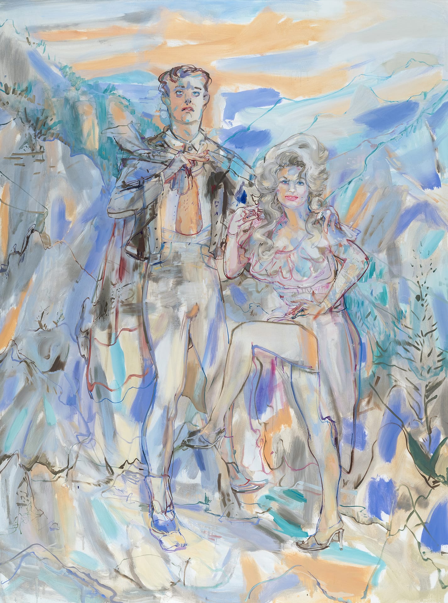 Dufresne: I love your first thrust into this conversation—where does queerness play its part. So I made 35 paintings in conversation with the artist William E. Jones. And William basically directed me to make history paintings. One that he prompted me to make is called “Stalin’s Vagina.” Another is “Dolly Parton and Lord Byron.” And when I started painting his portrait in 2017, I realized, “Holy shit, this bitch is going to boss me around.” I’m supposed to be this hermetic studio artist who would never let a voice come in and pollute my singular, intuitive imagination. And I’m like, fuck that, pollute me! Because the hermetic definition of a painter and their intuition is total bullshit, especially given the shit show politics that we live in right now. So William is my ultimate queer kin, only to be topped by Werner Schroeder, the great German director, and the closest thing in cinema that I’ve found to what I care about in painting or what I wish painting would do. His films destabilize our relationship to representation and to narrative. To me, breaking the fourth wall in cinema and distortion in painting are the same thing.