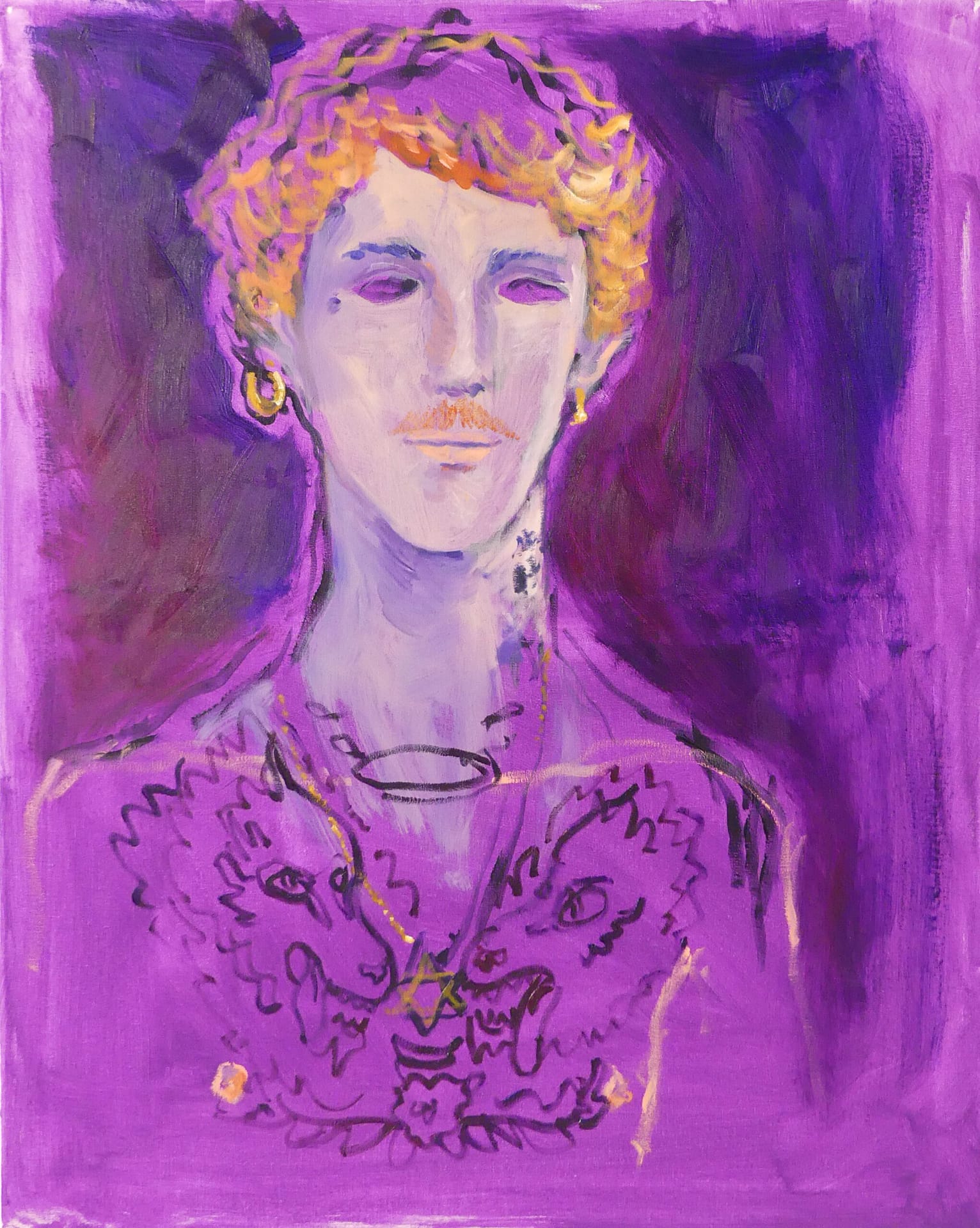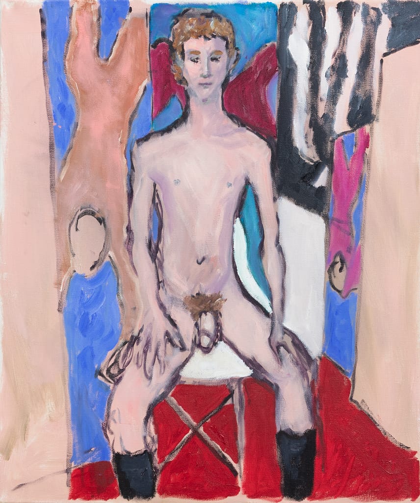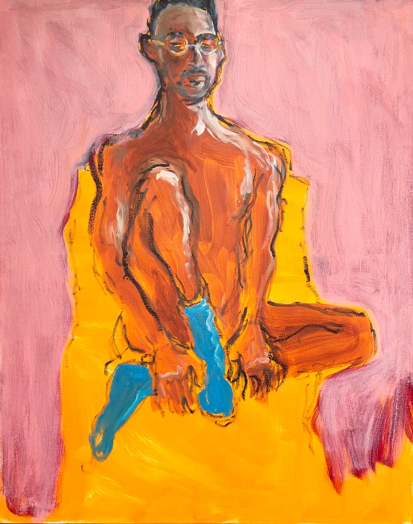 I remember seeing Haines around that time in Milan (once, to my enduring pleasure, he drew me sitting across from him at a show). I loved his splashes of color, the way his quick elegant lines created the impression of movement, a certain ephemeral quality, the sense of air moving. His new work is a leap forward, though. The paintings reflect all the suppleness of his drawings, but there is a Fauvist quality, a fierceness. In “Mordechai with Screen and Mirror,” (2023) the canvas pulses with color, while Mordechai sits pale and pink, wearing only a pair of black socks. It’s infinitely touching, full of pathos and empathy. There are a few other Mordechais. There’s “Blue Mordechai” (2023), and Mordechai in front of striped fabric and a mirror (this time with white socks). In each Mordechai there is an ease, a familiarity. “I want to have them be comfortable and put them at ease, and I also want to hear their story,” says Haines. Kostenbaum (in the catalog essay again) writes that Haines’s figures “manage to wear the look of a young flower being observed by an older flower.” The older flower, in this case, is a survivor of a plague. You might not be wrong to think the young flower represents all of those who did not survive with him. It’s no coincidence that Mordechai is 30, or thereabouts—about the same age as Haines when AIDS turned his world upside down.